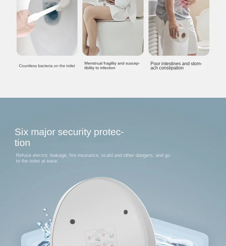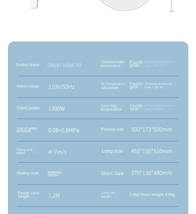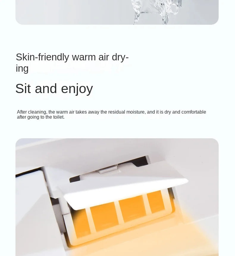 Advanced Function: Instant Hot Type,Water Temperature Adjustment,Buttocks Washing,Female Washing,Seat Heating,Warm Air Drying,Nozzle Self-cleaning,Movable Nozzle Cleaning