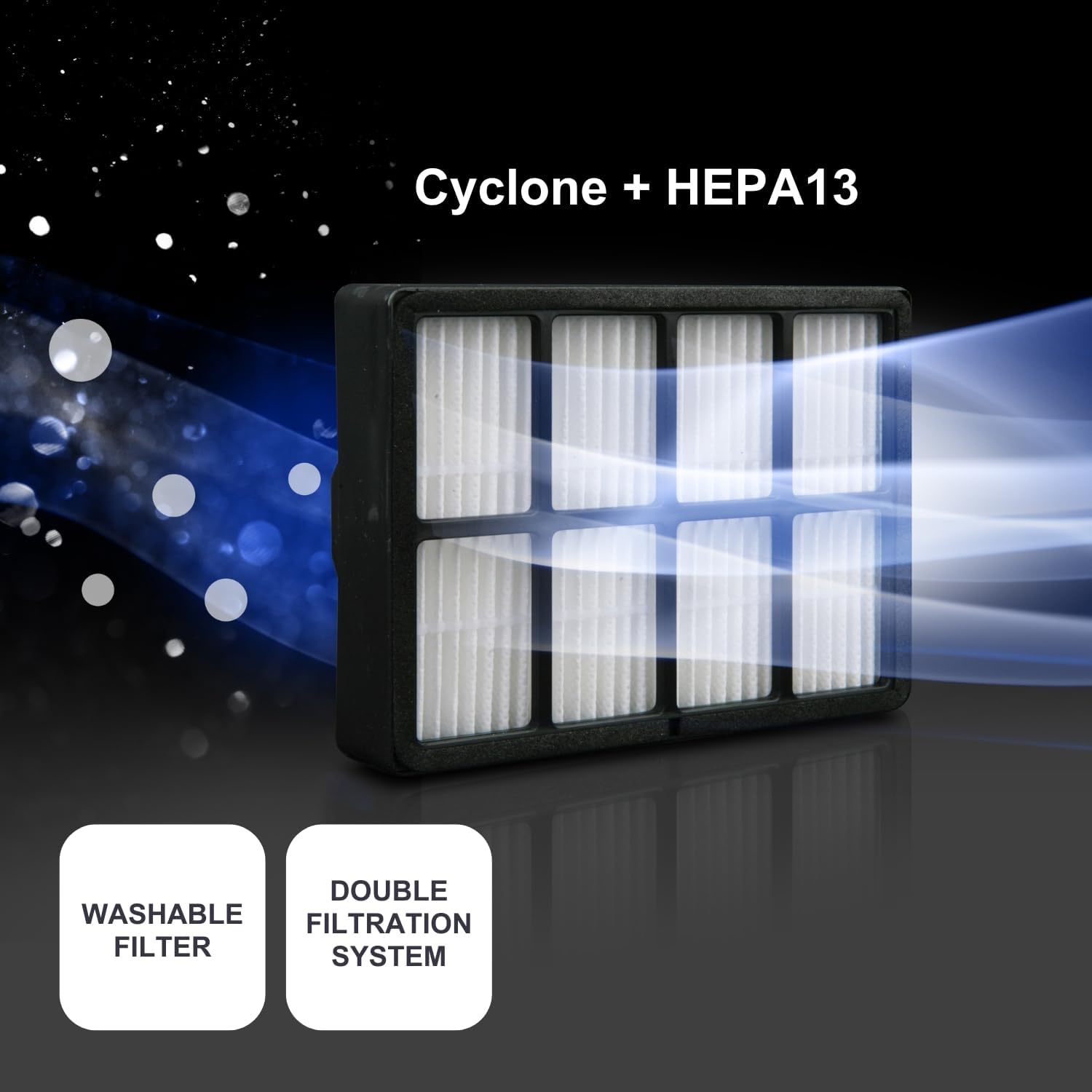 It incorporates a dual filtration system combining cyclonic technology and HEPA13 filter, capable of retaining up to 99.95% of allergens, with washable filters for greater longevity.