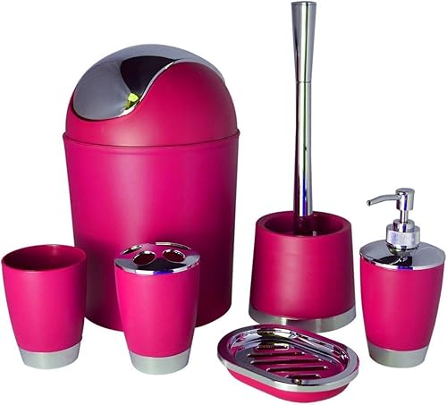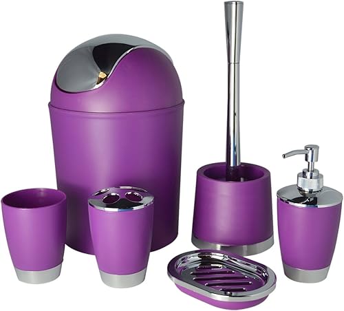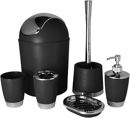 The Bathlux set includes 6 contemporary bathroom accessories, including a toilet brush, trash can, soap dish, toothbrush holder, soap dispenser...