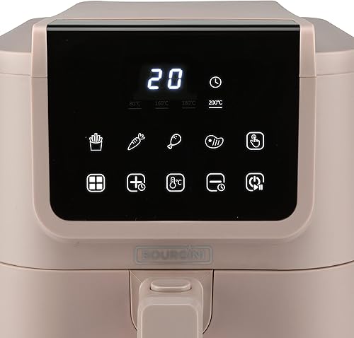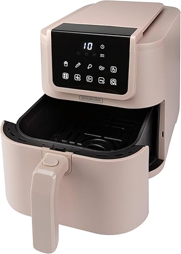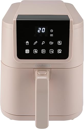 The BOURGINI air fryer features a professional ceramic coating that is free from harmful chemicals (PFAS, C6, PFHxA, PTFE, PFOA, and BPA). Its 35% smaller size fits perfectly into tight spaces, offering a healthy and compact option for non-toxic cooking (5 liters - beige).