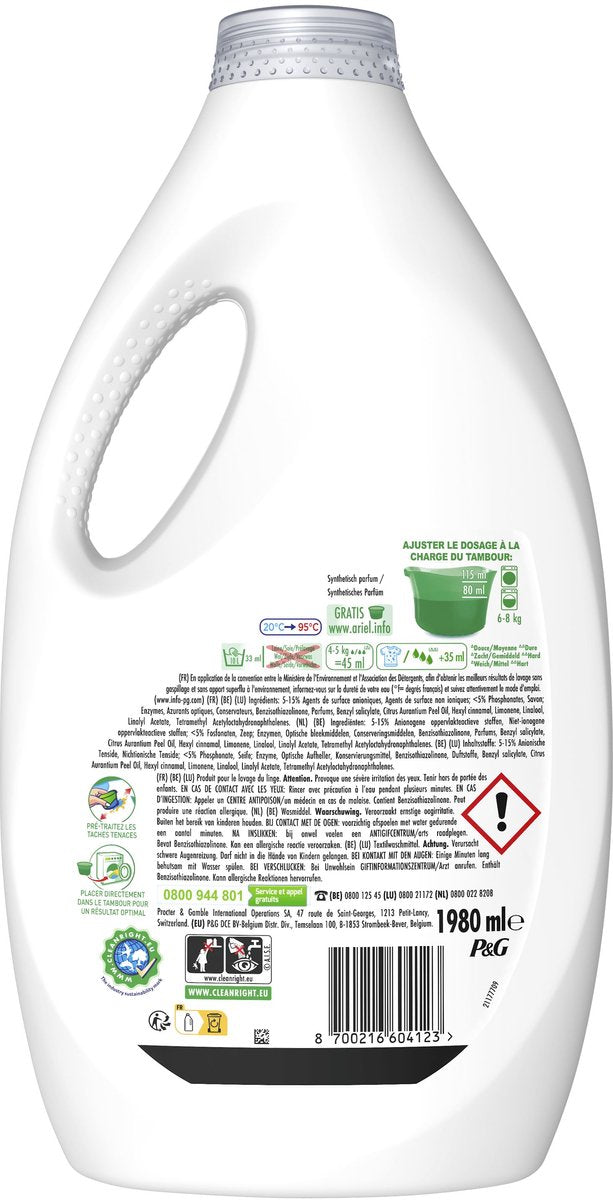 Made in France, Ariel liquid laundry detergent offers an effective solution for pre-treating stains: apply a small amount directly to the affected area, rub gently, then start the wash. For best results, fill the green cap to the mark, pour it into the drum with the laundry, and start the cycle.