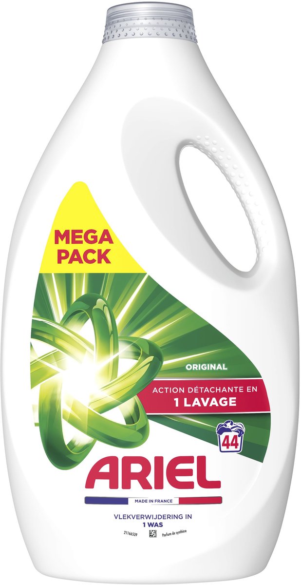 Ariel Original liquid laundry detergent, made in France, guarantees effective stain removal in a single wash. To pretreat, apply the detergent with the green cap, then place the clothes in the washing machine.