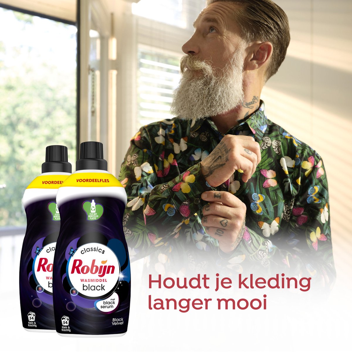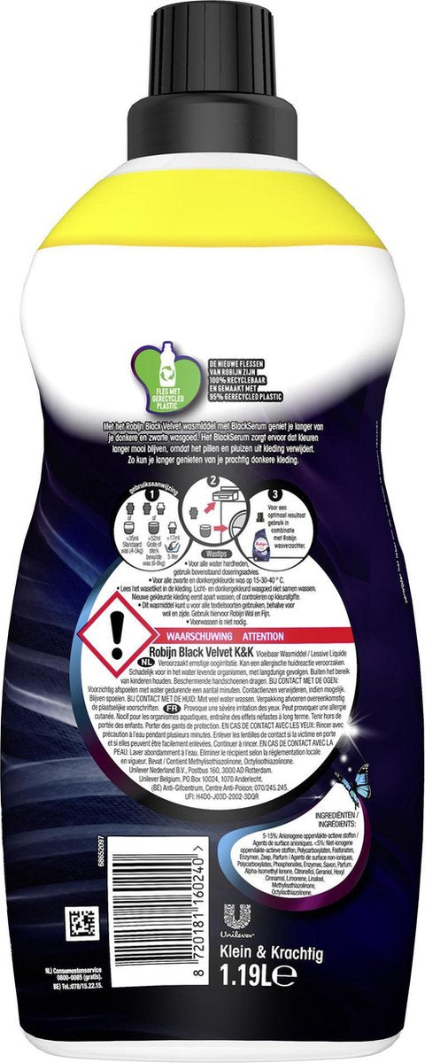 Robijn Klein & Powerful Classics Black Velvet liquid detergent, formulated with a black serum, maintains the shine of dark and black clothes. Specially formulated for black laundry, it protects the color and quality of fabrics while releasing a fresh, subtle fragrance.