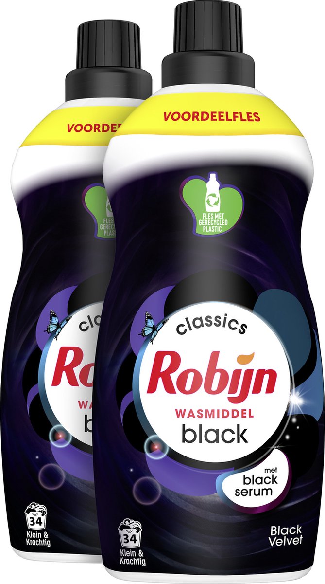 Robijn Klein & Powerful Black Velvet liquid detergent is available in a value pack of 2 bottles, each providing 34 washes. All Robijn detergents are now packaged in bottles made from 70% recyclable plastic, while retaining the signature scent users love.