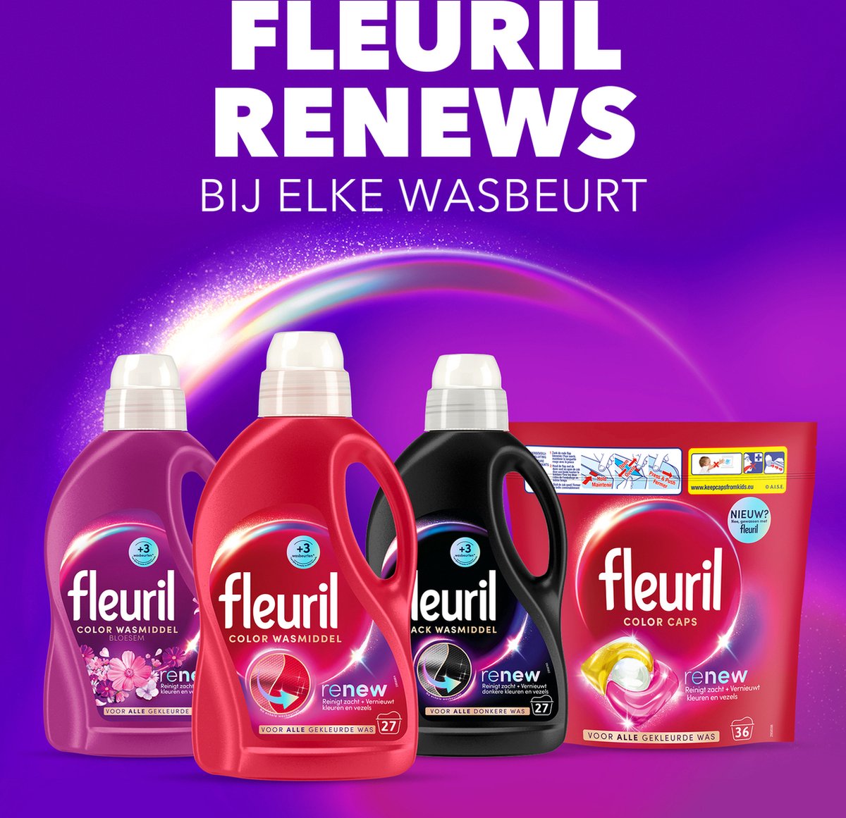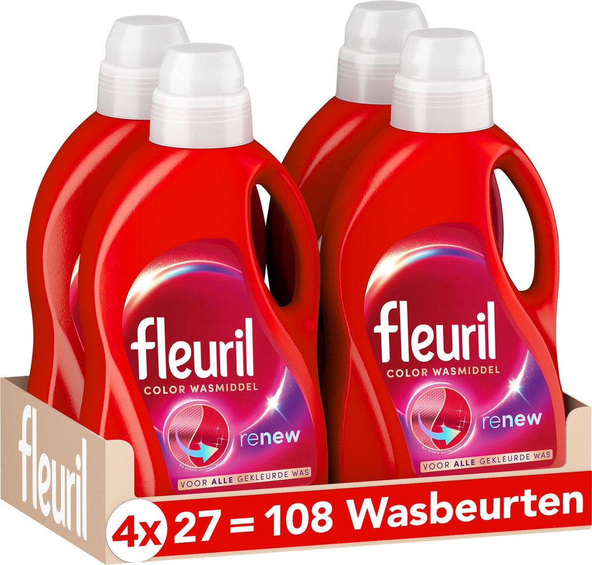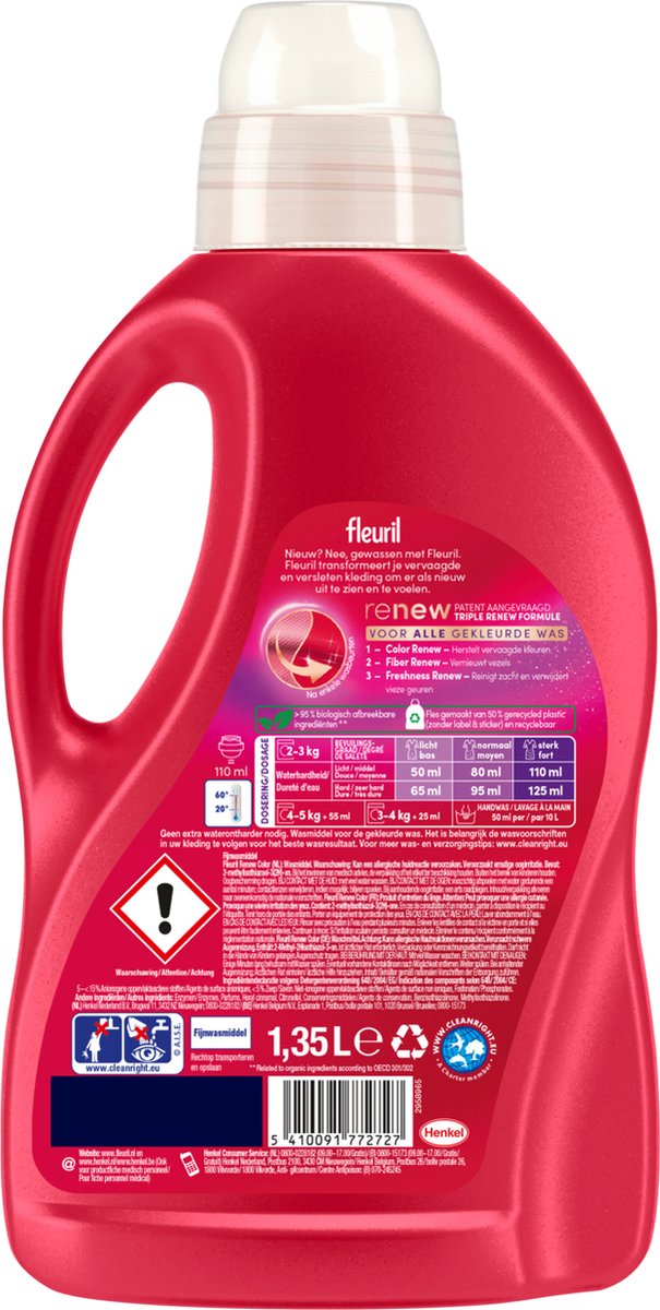 Fleuril Renew Color – Liquid detergent in a value pack containing 4 bottles for 27 washes each. Nothing new, just the choice of a reliable detergent: Fleuril Color for efficient, color-friendly washing.