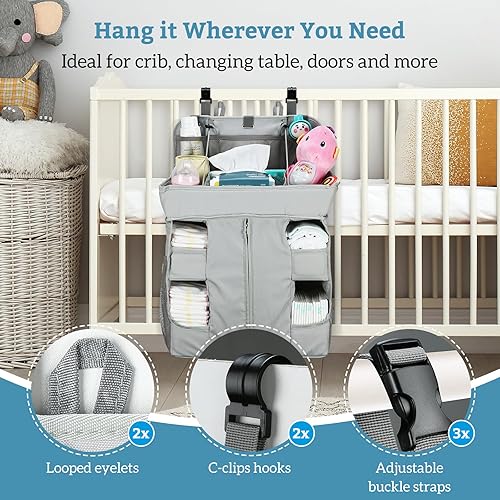 This bag features three types of hook, eye, and adjustable strap attachments for quick and secure installation in different locations, such as a crib or car seat.