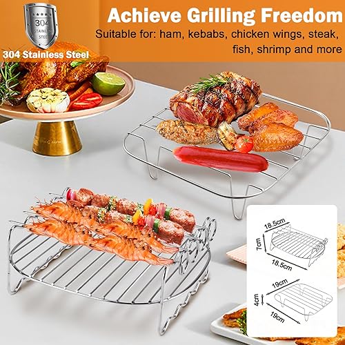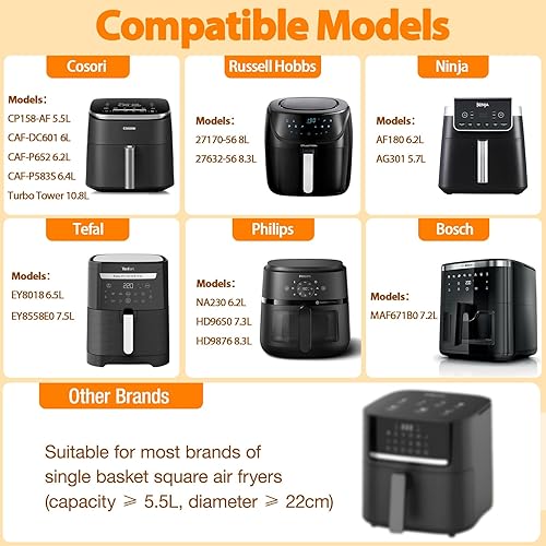 This 20-piece air fryer accessory set is designed to fit most popular models such as Philips Airfryer 2000 Series 6.2L NA230, Ninja AF180EU 6.2L, COSORI 5.5L, Russell Hobbs 8L, and Tefal EY8018 6.5L.