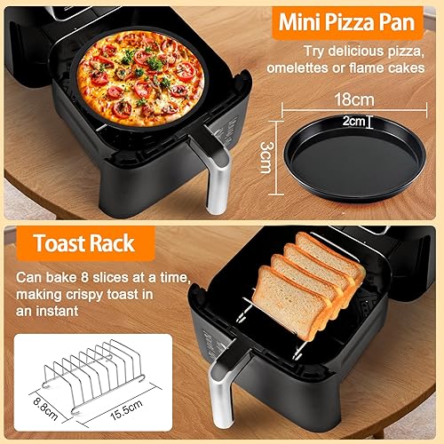 20 Pcs Airfryer Accessories Set: 1 Deep Fry Basket, 1 7" Pizza Pan, 6 Silicone Muffin Pans, 2 Bundt Cake Pans, 1 Toast Rack, 1 Stainless Steel Wire Rack, 1 Stainless Steel Skewer Rack with 4 Skewers, 2 Separable Silicone Baking Molds, 1 Oil Brush, 1 Silicone Spatula, 1 Kitchen Tongs. 1 Pair of Heat Resistant Gloves.
