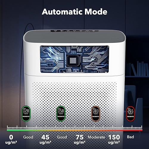 The MORENTO home air purifier features a HEPA filter that effectively removes particles, odors, and pet hair.