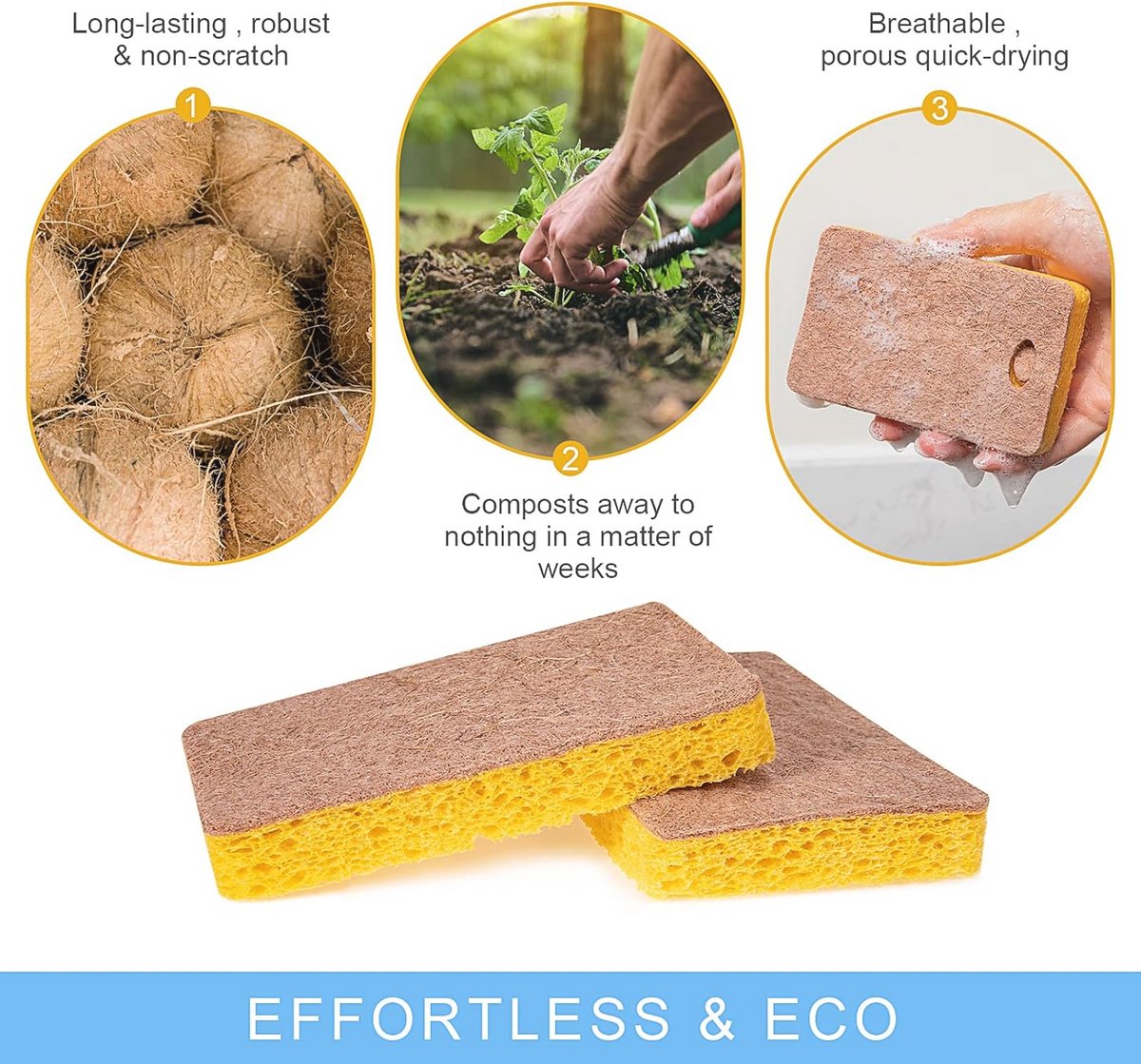 Set of 10 biodegradable kitchen sponges, made with natural materials such as cellulose, sisal and coconut fibers, guaranteeing gentle cleaning and total compostability.