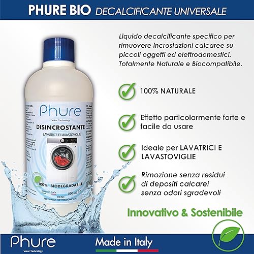 PHURE BIO DECALK, naturally biocompatible, is a 500 ml product formulated to descale, degrease and deep clean dishwashers and washing machines, thus ensuring complete and effective maintenance.
