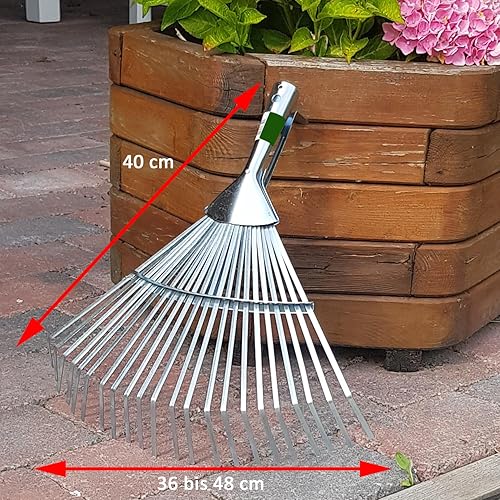 The Land-Haus-Shop garden rake is a professional tool designed to make maintaining your green space easier. Its adjustable width of 36 to 48 cm allows you to precisely adapt it to your needs, while the galvanized metal head ensures great durability and corrosion resistance.