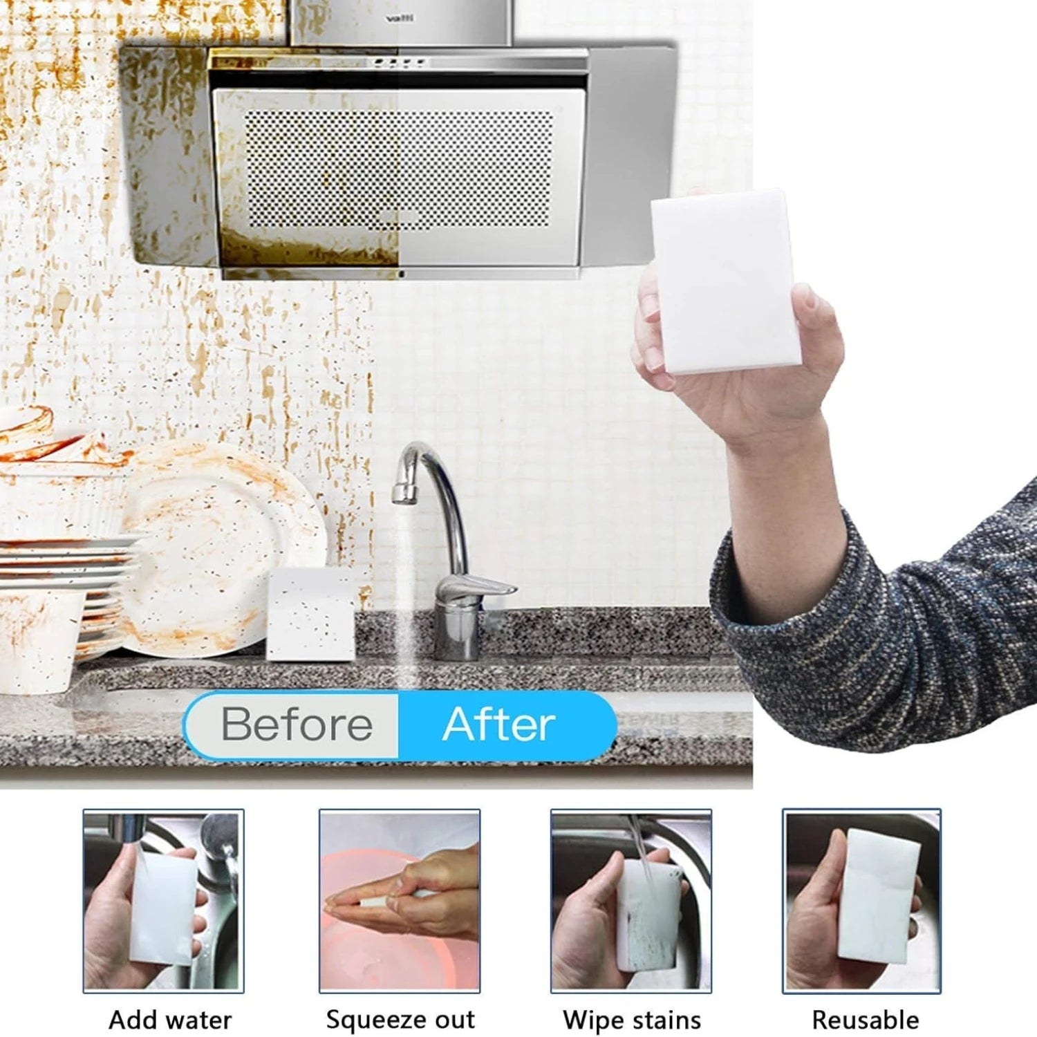 3. Safe for skin, removes tough stains with tap water.