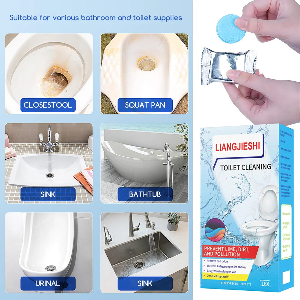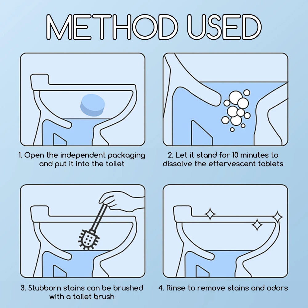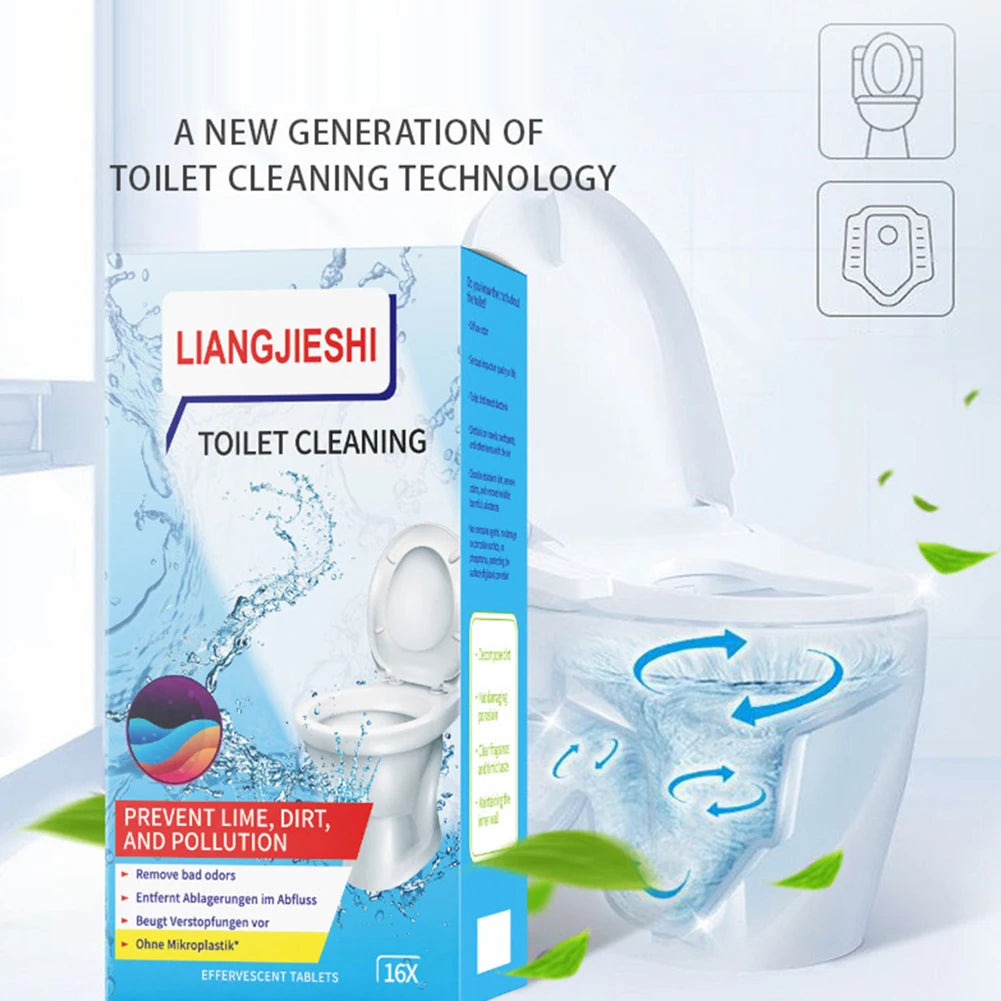 Effervescent toilet tablets, powerful toilet cleaner, toilet deodorizer, toilet bowl descaler, toilet tablets, 360° cleaning, bathroom odors, long-lasting freshness, ecological toilet maintenance, household cleaner.