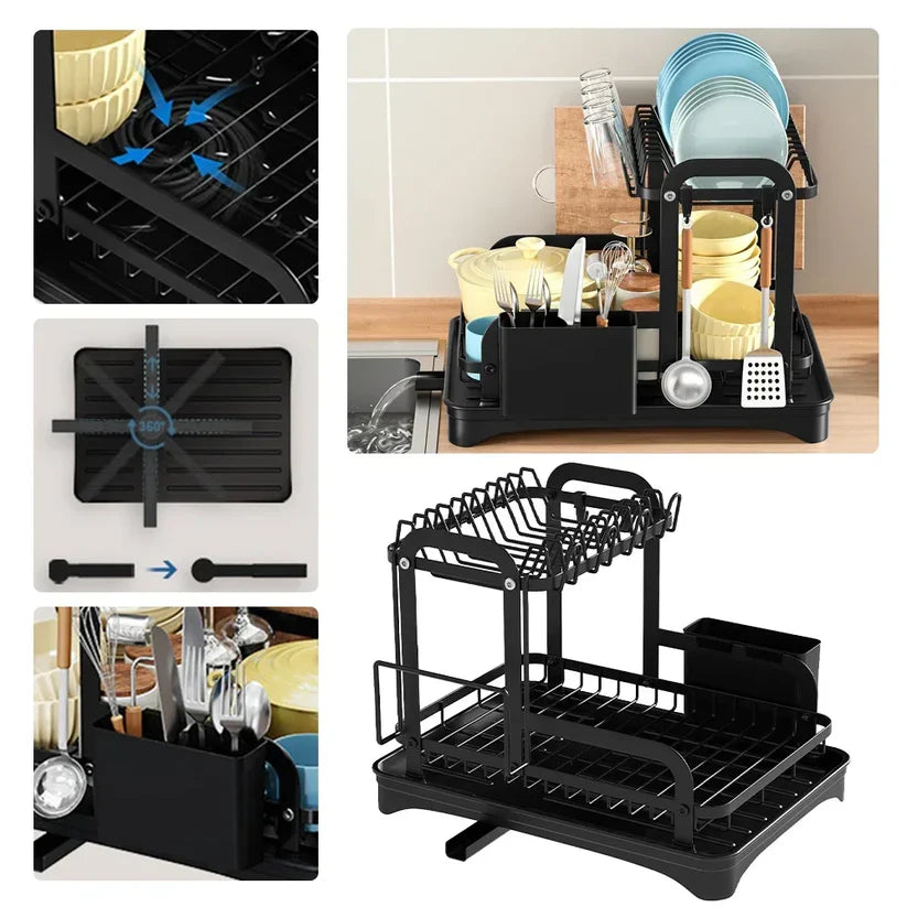 Égouttoir à vaisselle extensible à 2 niveaux en acier inoxydable avec porte-ustensiles et égouttoirs à vaisselle à suspendre au-dessus de l'évier