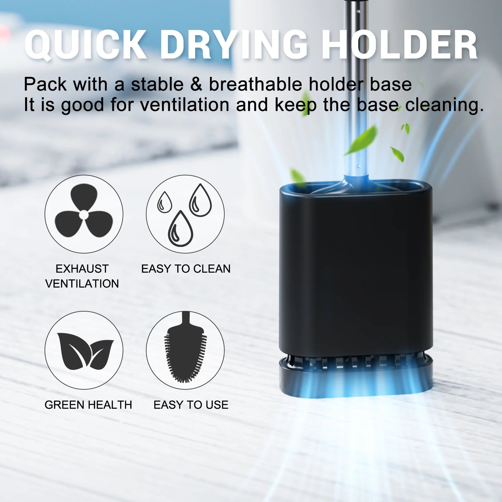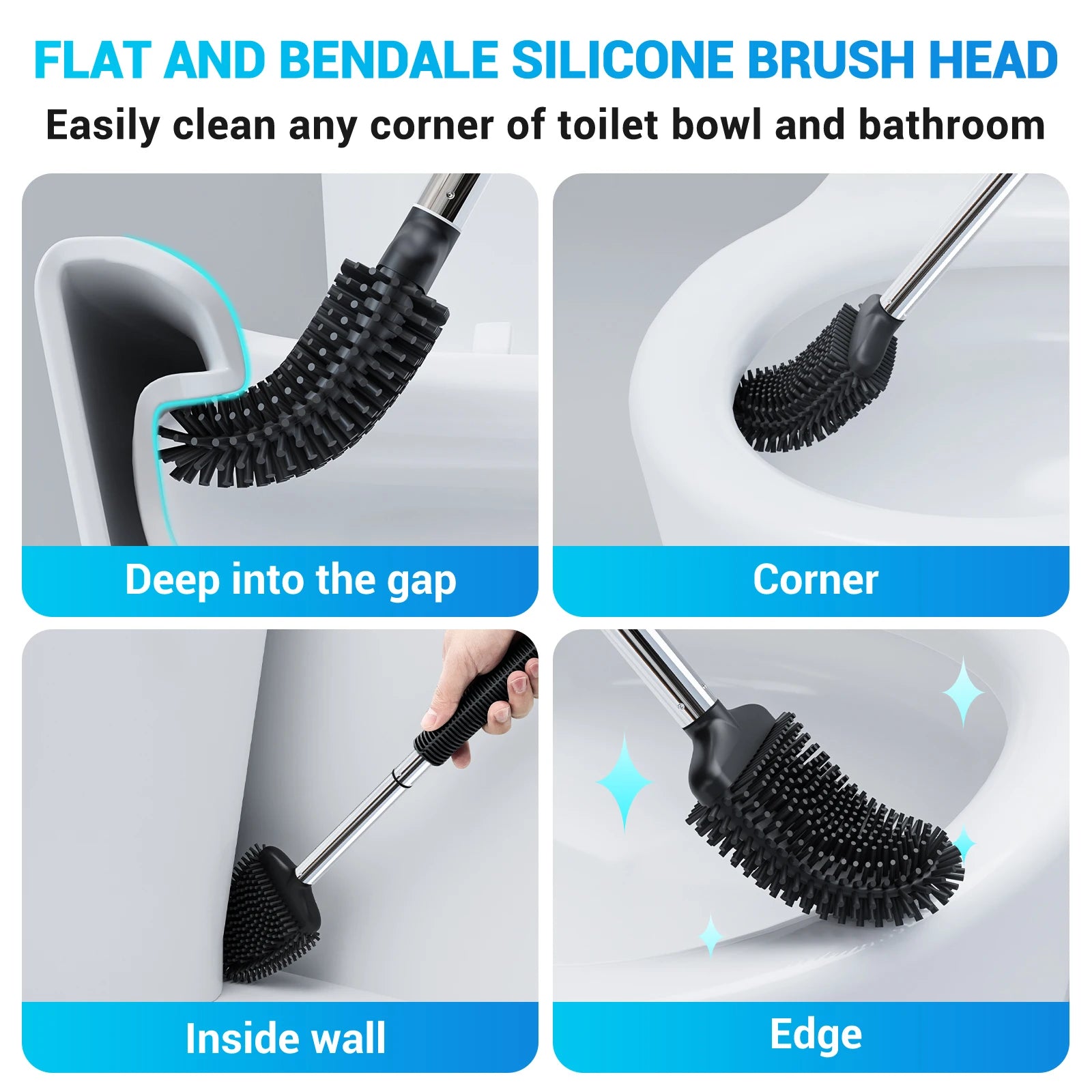 Brosse de toilette en silicone, nettoyage en profondeur, manche antidérapant en acier inoxydable et poils flexibles (noire), lot de 1