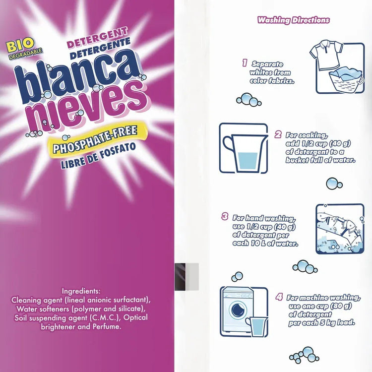 Découvrez la lessive en poudre biodégradable Blanca Nieves , le parfait équilibre entre nettoyage puissant et douceur respectueuse de la peau .
