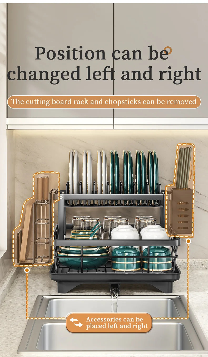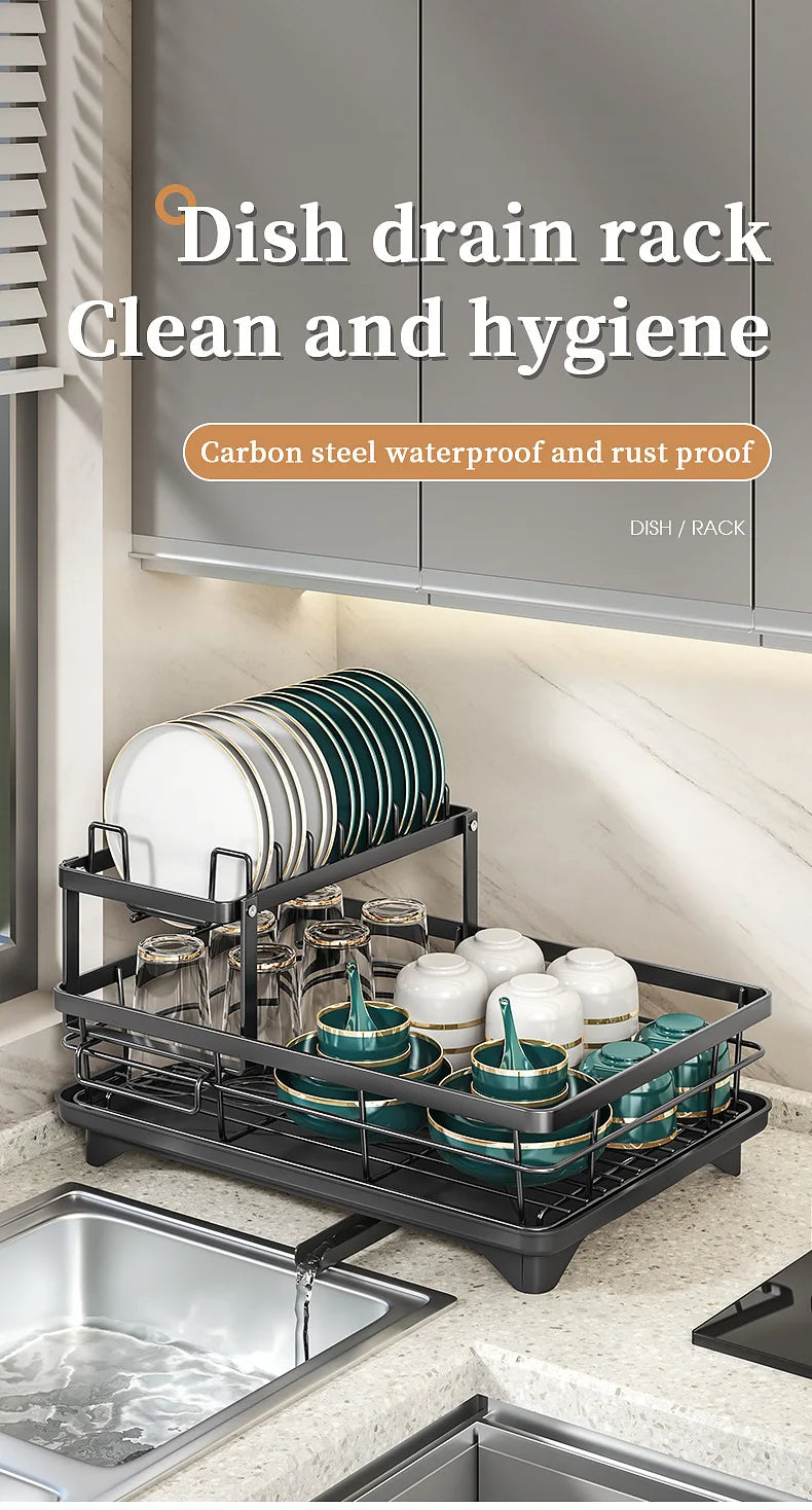 2-Tier Dishes Dryer Rack Metal Black Dish Drainer Large Kitchen Organizers and Storage Rack with Drainboard and Cutlery Holder