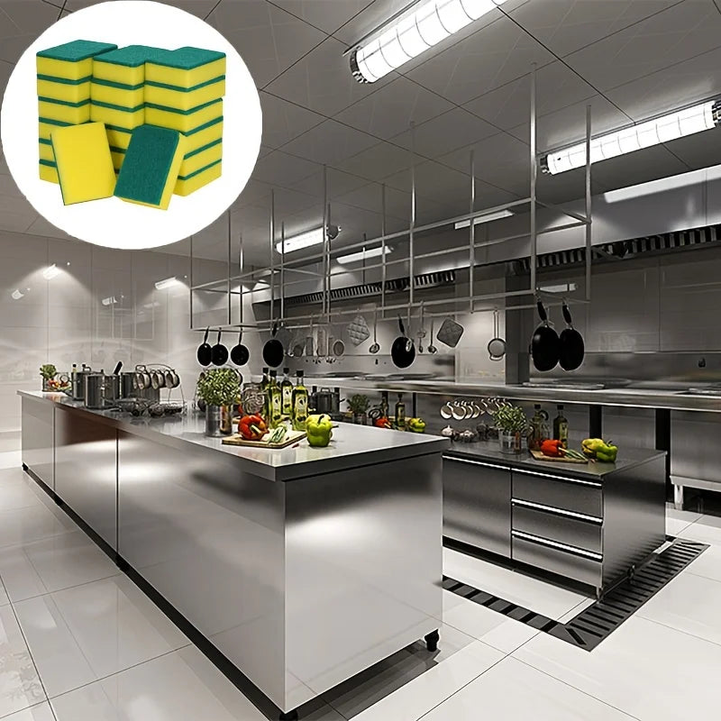 Ce lot de 20 éponges à récurer double face est idéal pour assurer un nettoyage efficace de la vaisselle, casseroles et autres ustensiles de cuisine. Chaque éponge combine une face douce pour les surfaces délicates et une face abrasive pour éliminer efficacement les résidus tenaces, garantissant ainsi un entretien optimal sans rayer vos équipements.