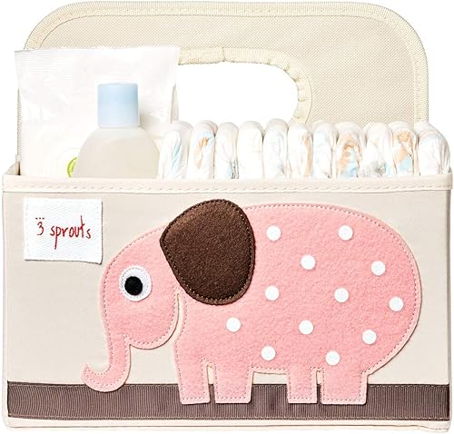 ce panier à couches 3 Sprouts, orné d’un éléphant rose, est une solution compacte et élégante pour organiser les couches.