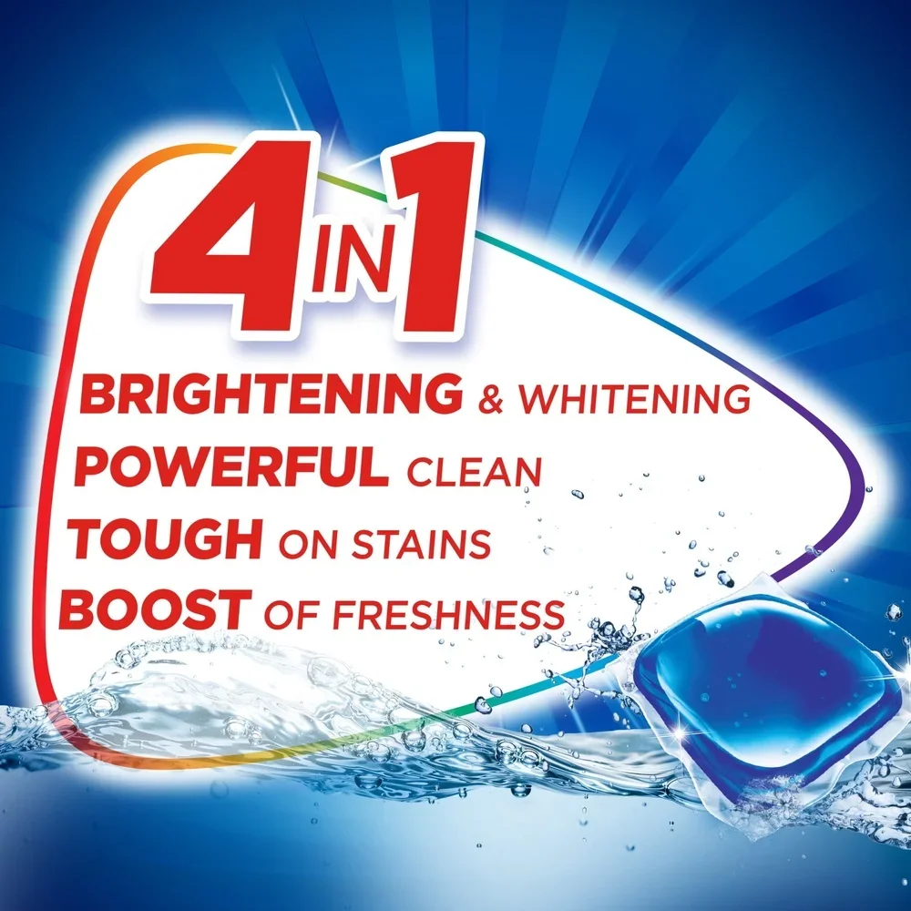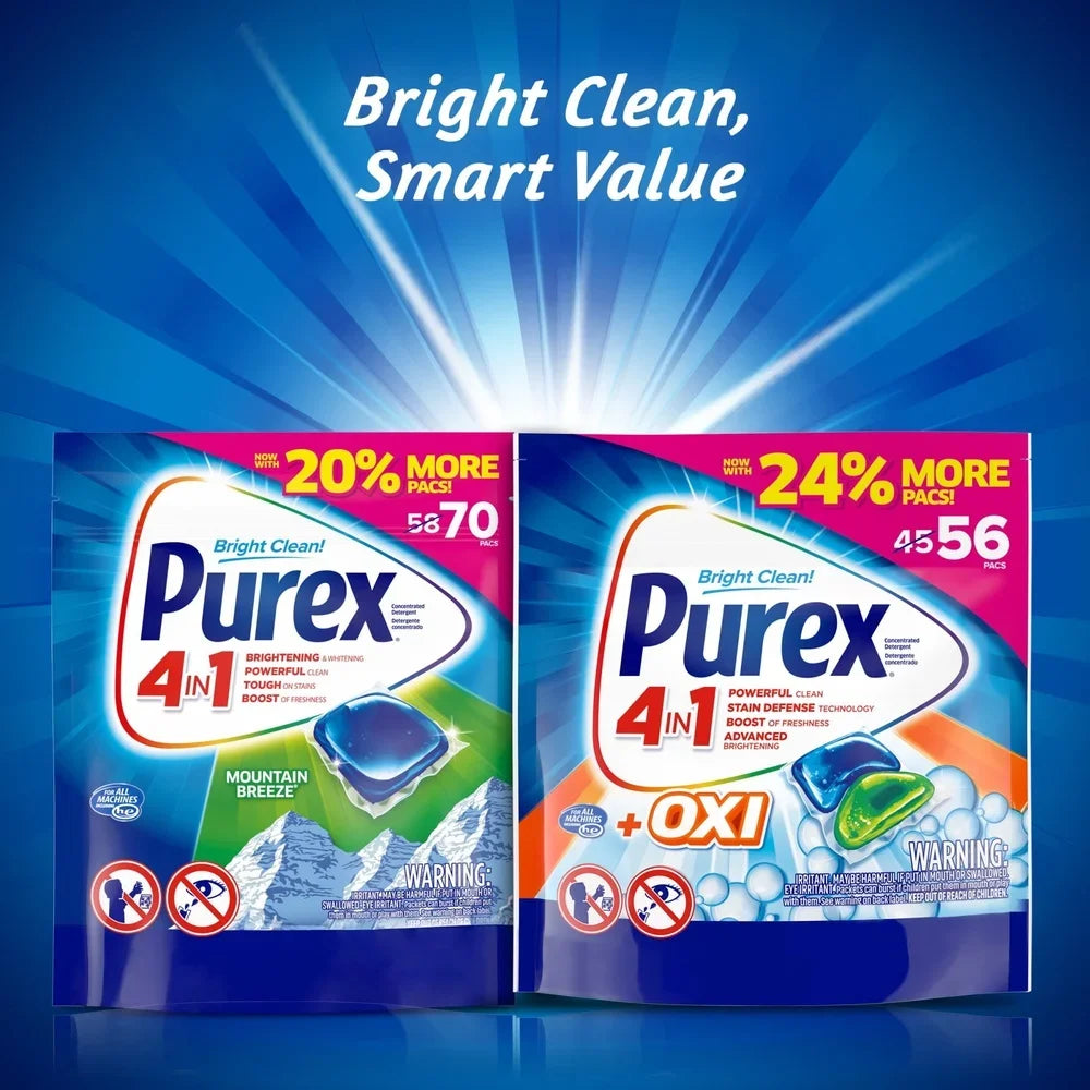 4-in-1 compact laundry pacs work hard so you don’t have to!  It’s the fresh Mountain Breeze scent you love in a convenient, easy-to-use form.  Optimized to dissolve in any water temperature, it releases concentrated laundry detergent that has a powerful clean in every drop.  No more measuring.  No more mess.  Just toss and go!  This package contains 70 packs , enough for 70 Loads