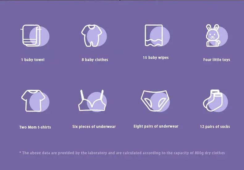 1. Grande capacité : 29,5 x 29,5 x 29 cm. Lavable : 1 serviette de bain, 8 vêtements, 15 pulls, 4 petits jouets, 2 t-shirts, 6 sous-vêtements, 8 sous-vêtements et 12 paires de chaussettes. (Données fournies par le laboratoire pour un calcul de capacité de lingettes de 800 g. Veuillez vous référer à nos données réelles.)