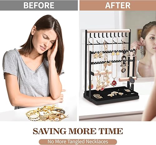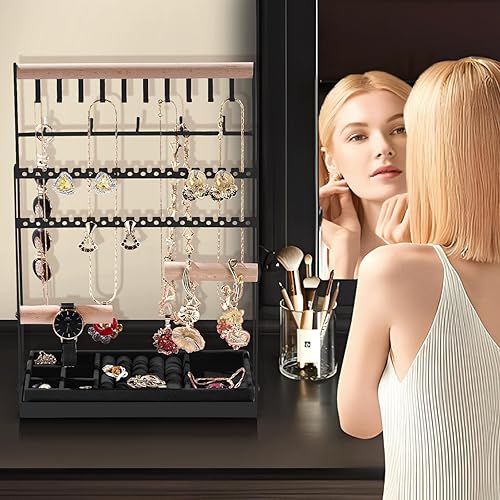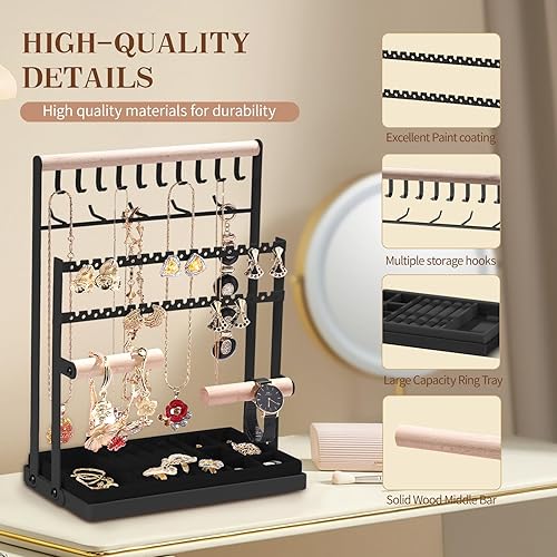 Le présentoir à bijoux AHYDFSR combine métal et bois durable avec un plateau en velours et des crochets pratiques, offrant un rangement organisé pour colliers, boucles d’oreilles et autres accessoires.