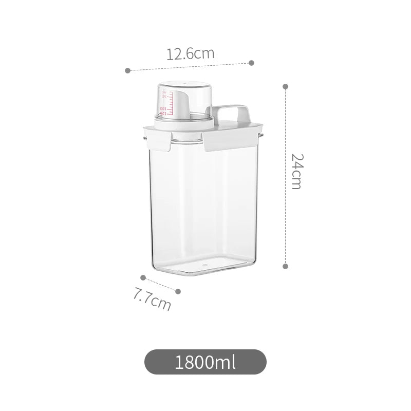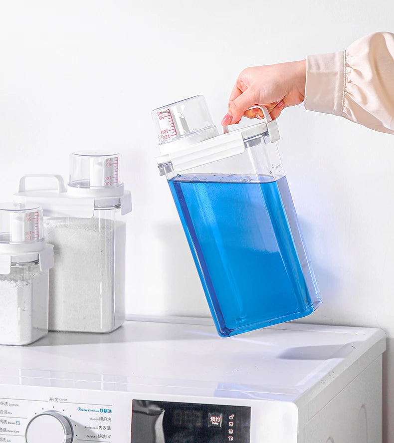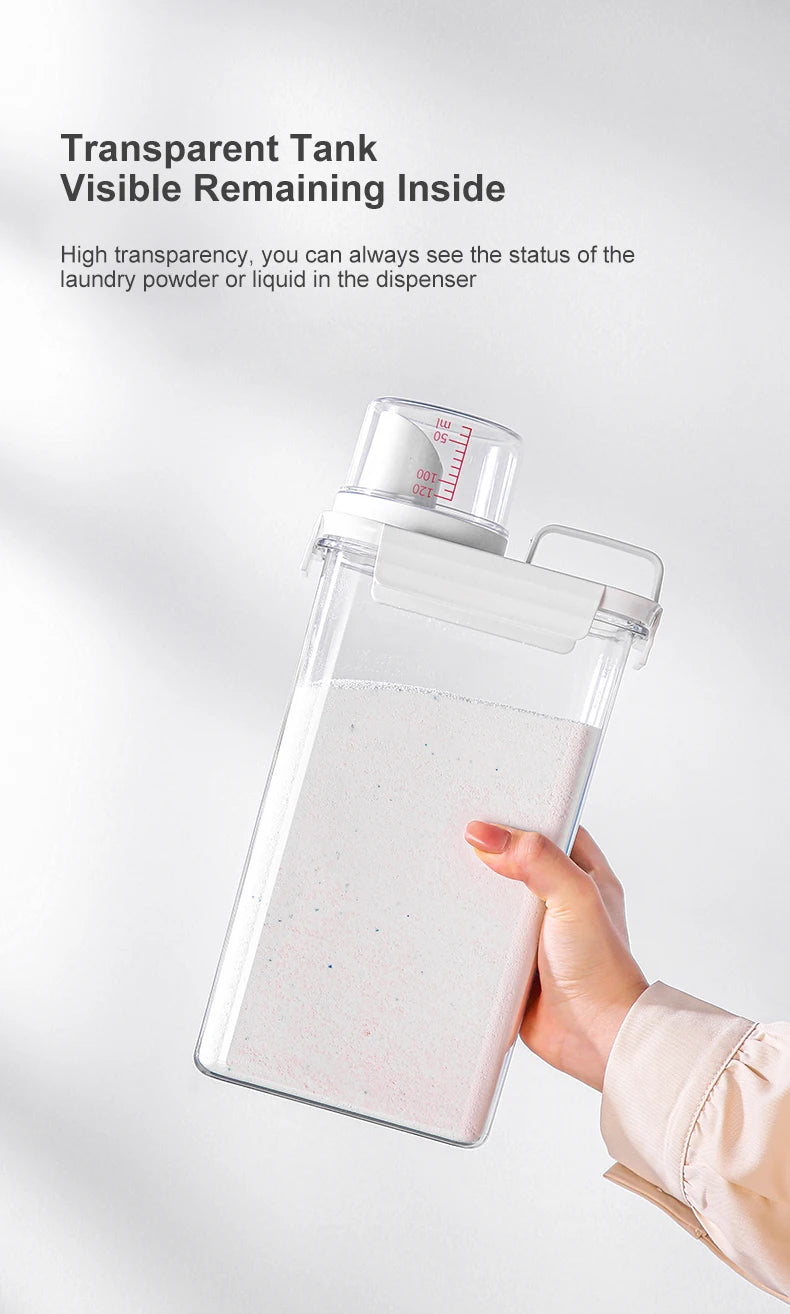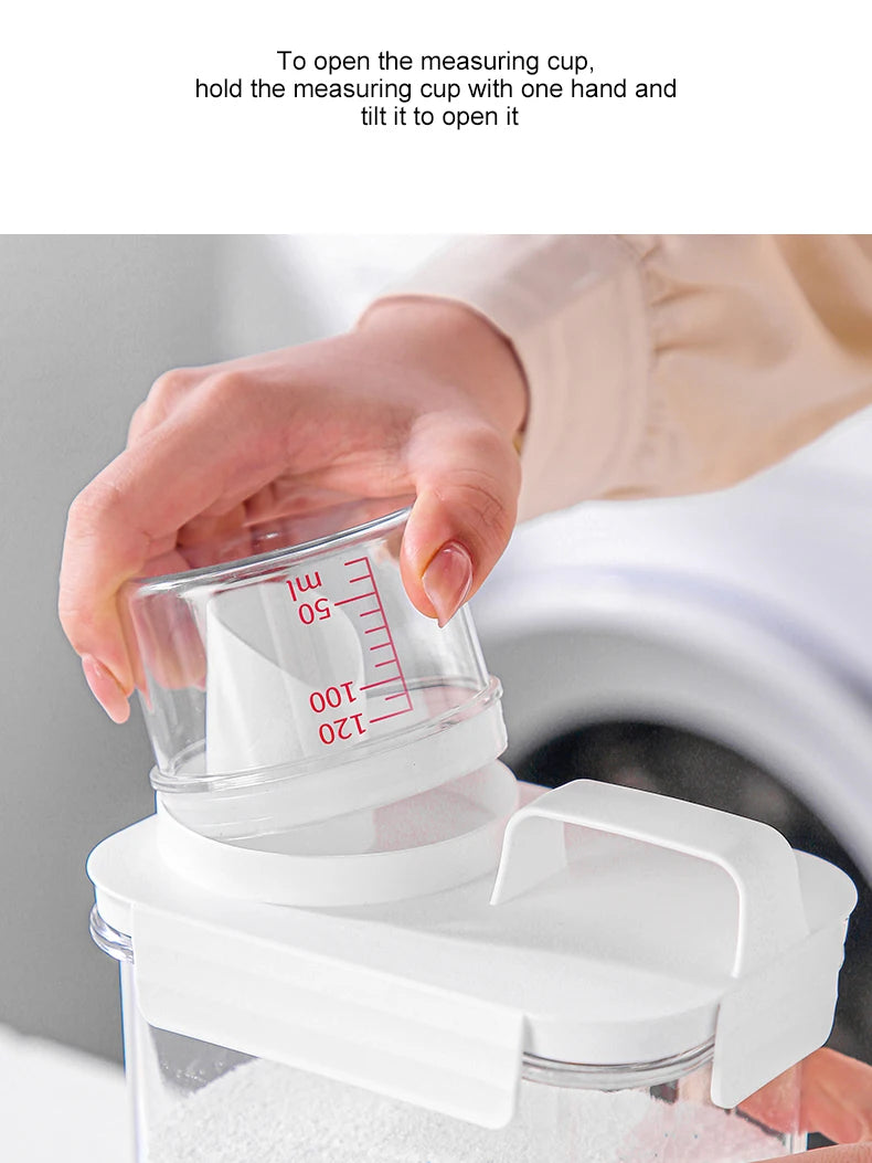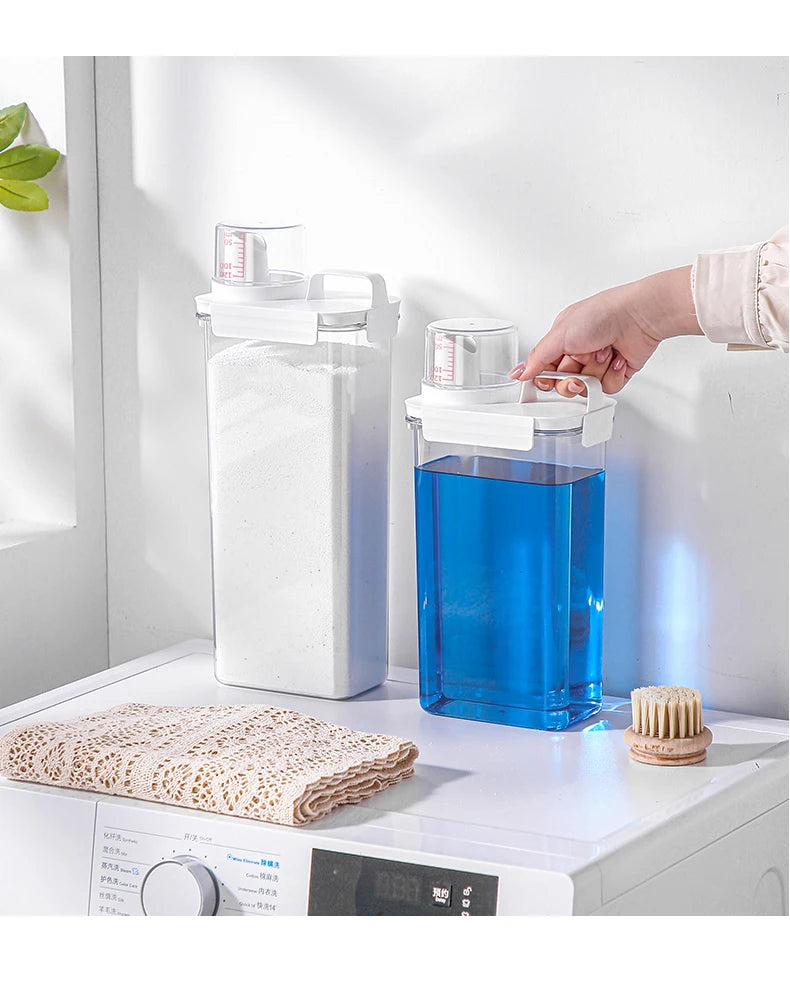 Réservoir hermétique conçu pour contenir la lessive liquide, équipé d’un verre doseur et d’un distributeur pour lessive en poudre, avec une capacité surdimensionnée pour une portabilité optimale.