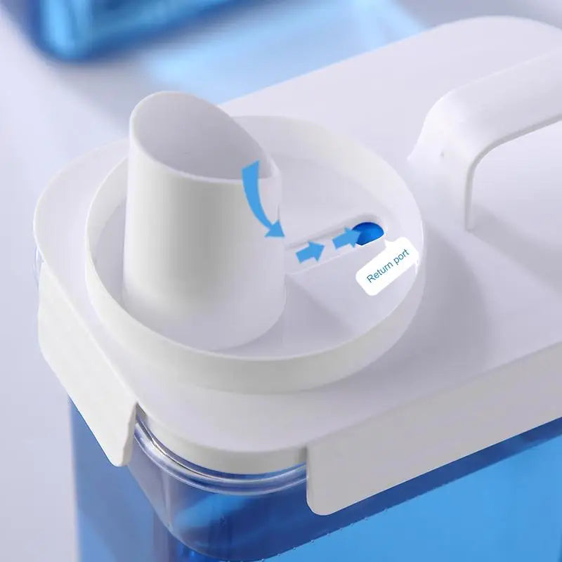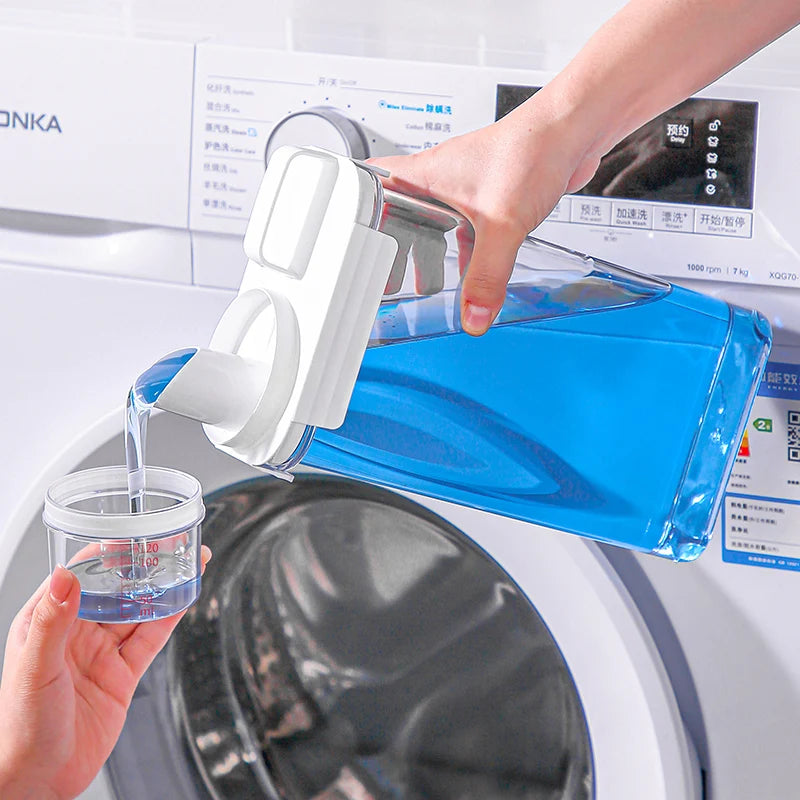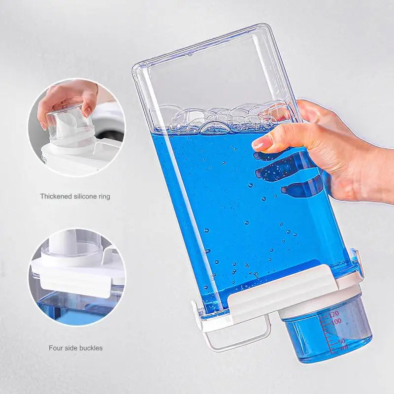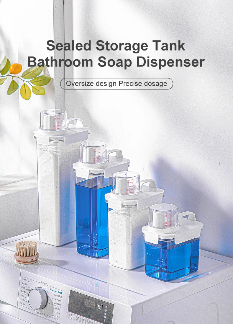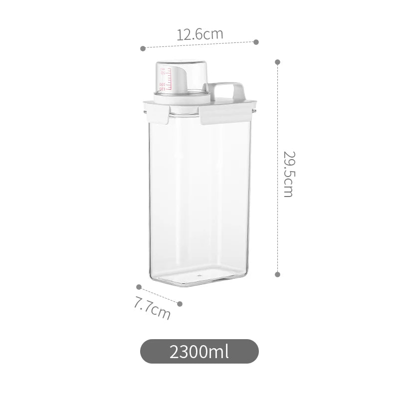 Réservoir hermétique conçu pour contenir la lessive liquide, équipé d’un verre doseur et d’un distributeur pour lessive en poudre, avec une capacité surdimensionnée pour une portabilité optimale.