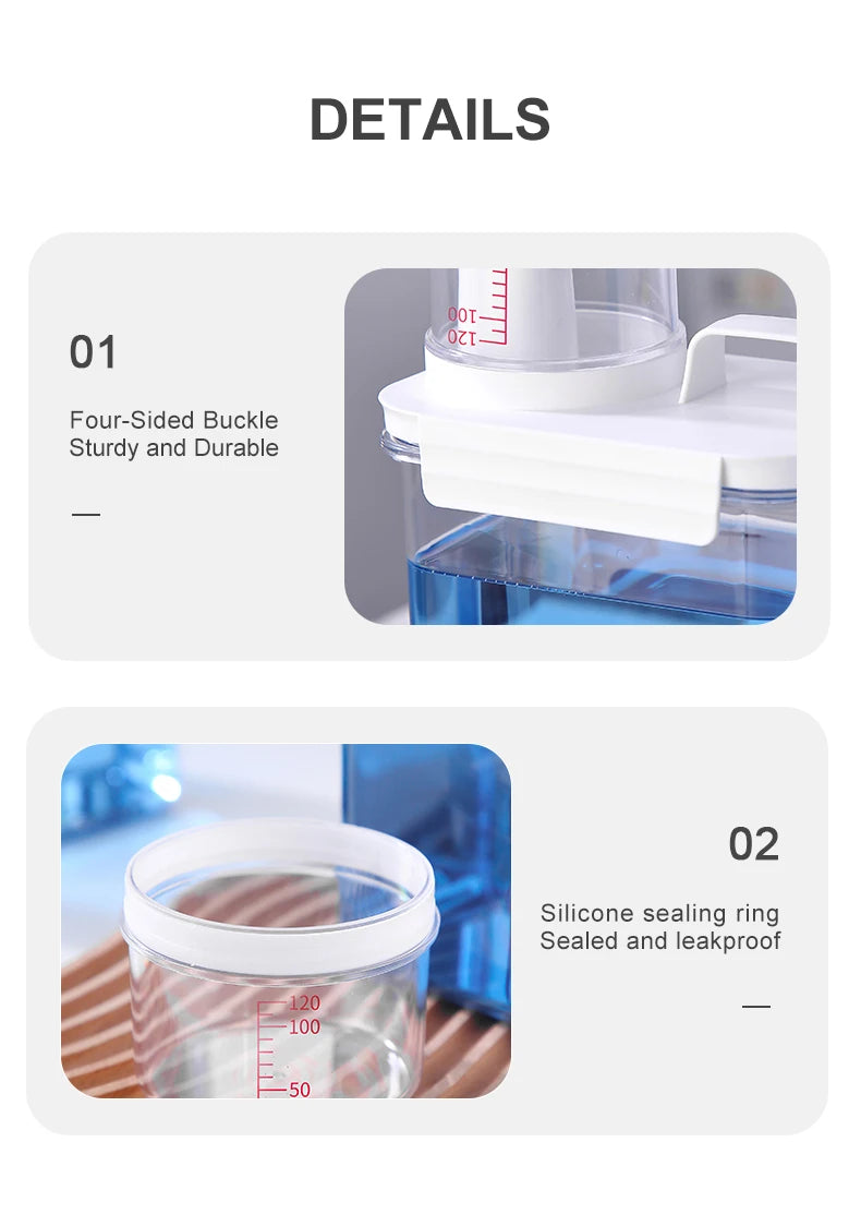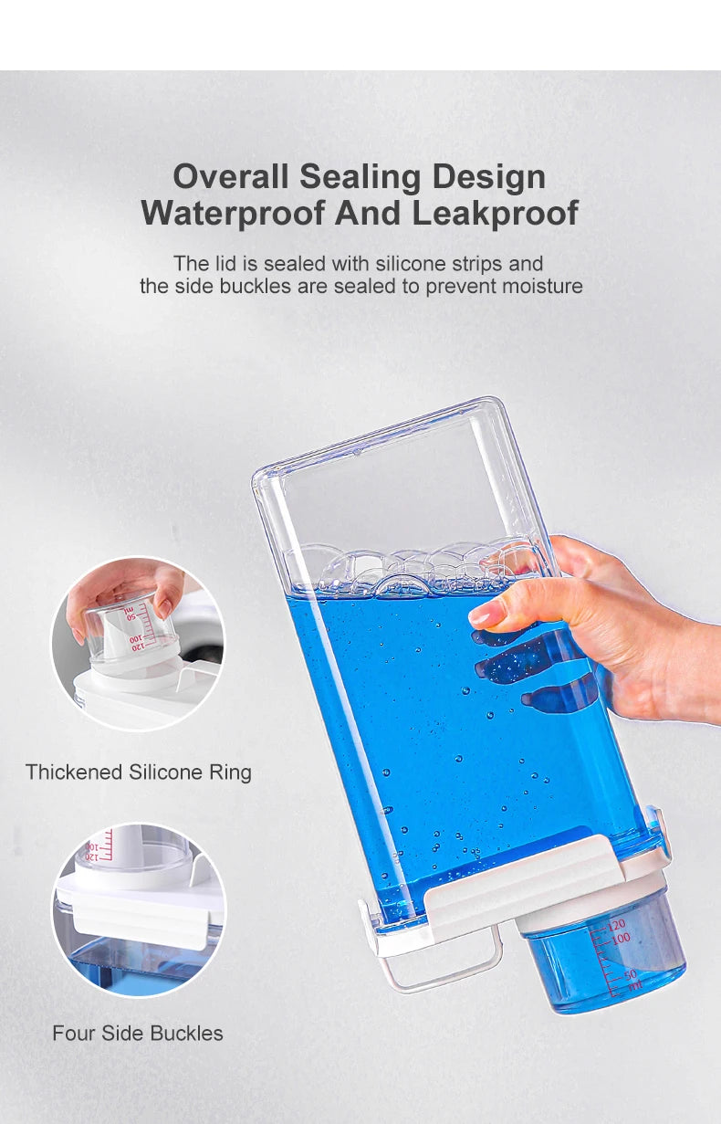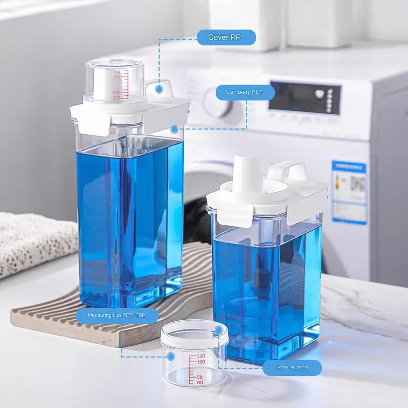 Fabriqué en PET de haute qualité, ce récipient pour liquide est léger, durable et sûr. Sa conception étanche unique empêche efficacement la pénétration d'humidité, gardant le contenu sec et sans grumeaux. Équipé d'un verre doseur précis, il permet un contrôle facile de chaque utilisation et évite le gaspillage. Disponible en quatre capacités : 1,8 L et 2,3 L (équivalent 1,8 l et 2,4 l), il répond à tous les besoins de la maison. Que ce soit pour ranger de la lessive, de la poudre à lessive, du gel douche, du savon pour les mains ou un nettoyant cuisine, ce récipient est à la hauteur. Son large goulot facilite le remplissage et le nettoyage. Optez pour ce récipient pour liquide et simplifiez-vous la vie !