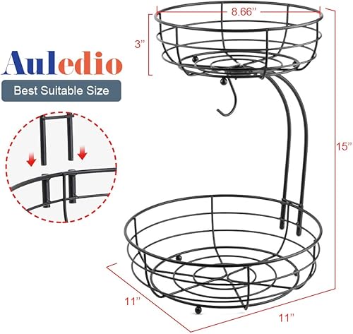 Auledio corbeille en métal à deux niveaux, dotée d’un support pour bananes. Ce bol polyvalent noir sert à la fois de panier à fruits, support à légumes, et rangement pratique pour pain, idéal pour organiser votre cuisine avec efficacité.