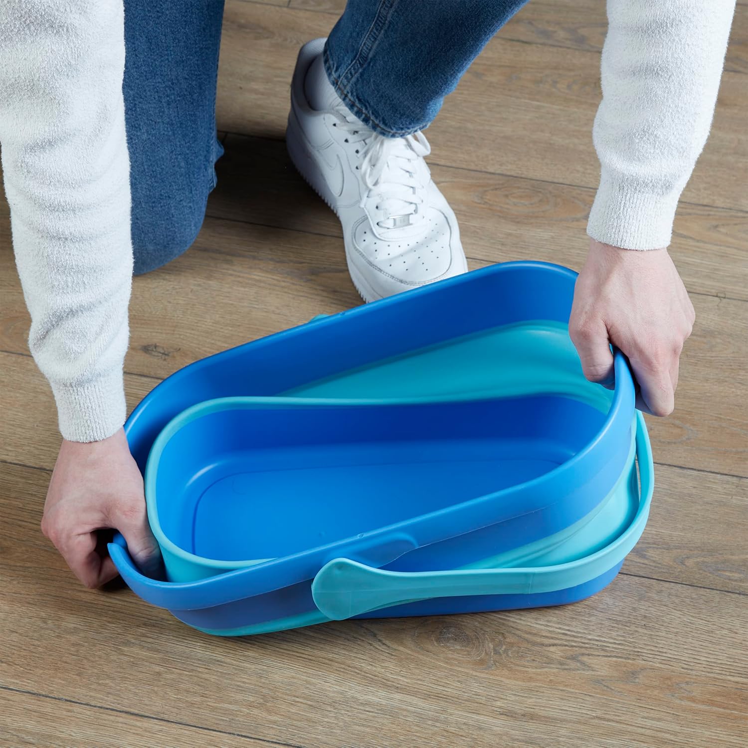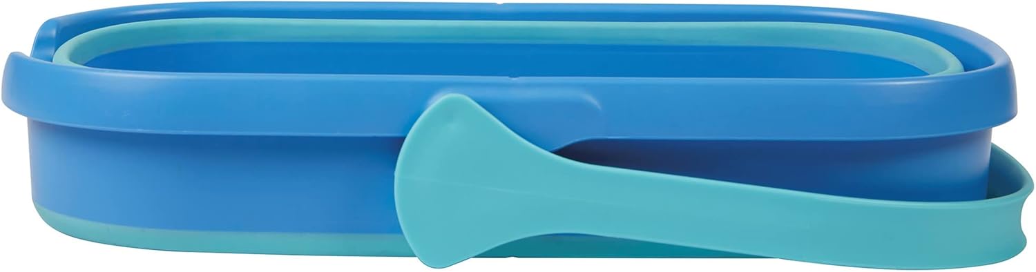 Son manche télescopique se démonte en 5 pièces pour un rangement compact dans le seau rétractable de 10 litres, fabriqué partiellement en plastique recyclé.