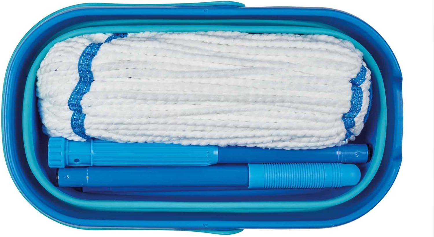 Le Kit Balai serpillère & seau ultra-compact Twist Mop comprend des franges en microfibre dotées d’un système d’essorage intégré et un seau rétractable de 10 litres.