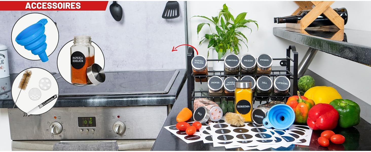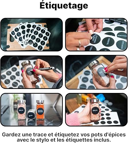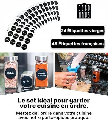 Le kit inclut 48 étiquettes pré-imprimées en allemand avec les noms des épices les plus populaires, ainsi que 24 étiquettes vierges accompagnées d'un marqueur pour personnaliser vos propres noms d'épices.