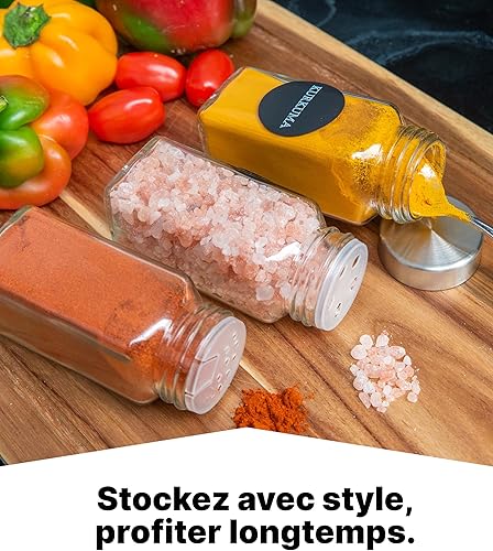 Les pots à épices mesurent 10,5 cm et 4,3 cm de large avec le couvercle. Ils ont une capacité de 120 ml.