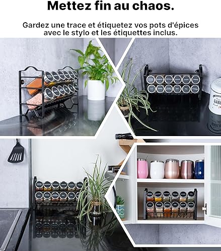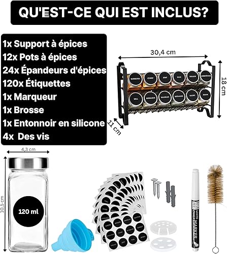 Cet article comprend une étagère à épices, 12 pots à épices avec couvercles en acier inoxydable, un entonnoir, un marqueur, 48 étiquettes pré-imprimées et 24 étiquettes vierges, une brosse, des tampons anti-rayures et des crochets.