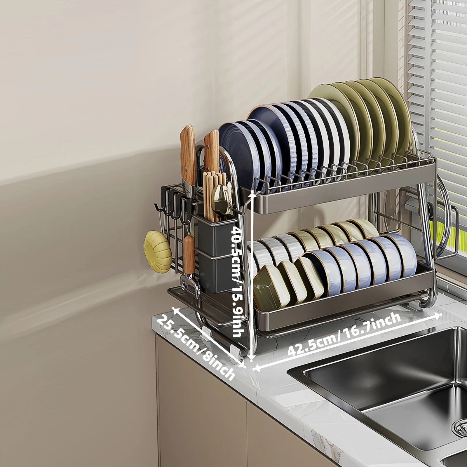 Dish rack, Stainless steel dish drainer, Multi-functional 2-tier dish drying rack with draining tray, utensil holder, hooks