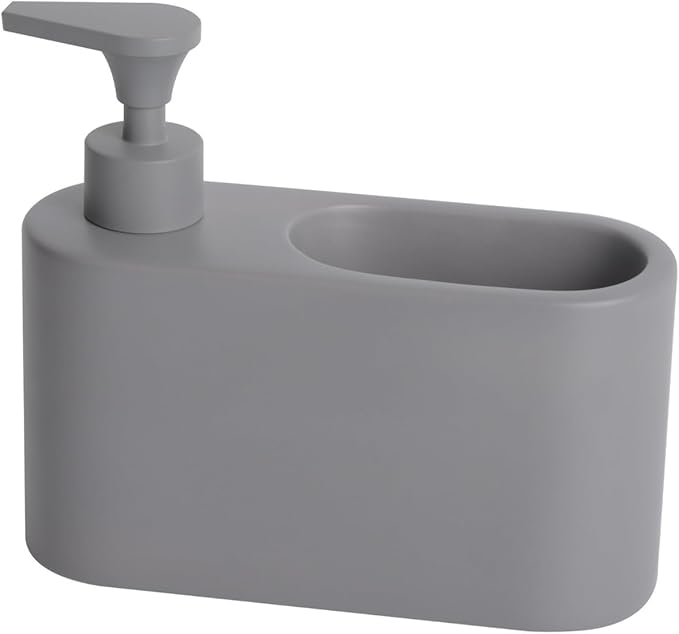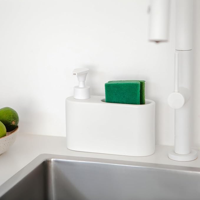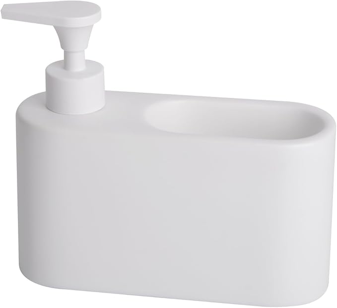 Distributeur de liquide vaisselle avec porte-éponge intégré pour cuisine.