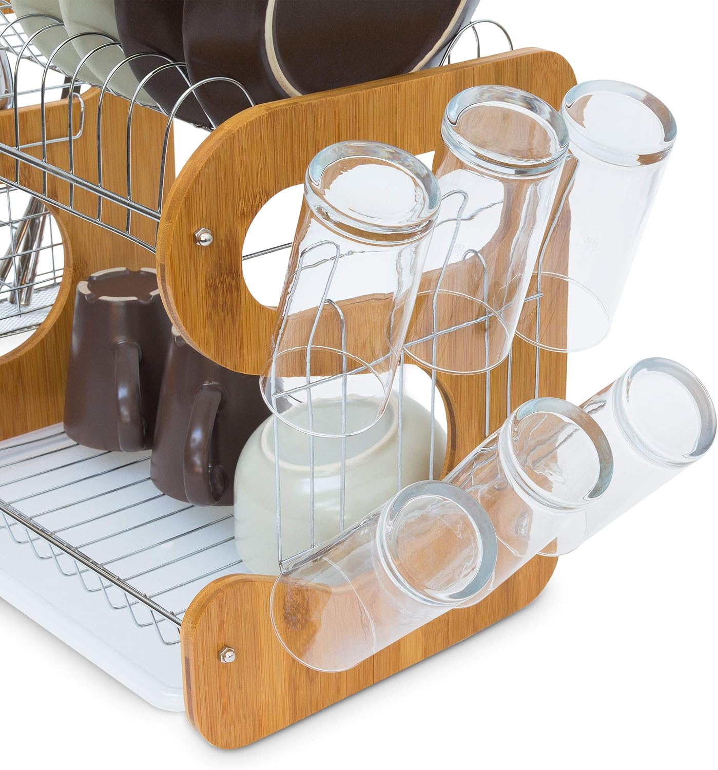 Relaxdays Égouttoir à vaisselle 2 niveaux en bambou, avec porte-couverts intégré, bac collecteur d'eau et crochets latéraux pour tasses et assiettes en métal. Dimensions (HxlxP) : 35 x 51 x 26,5 cm, finition naturelle.