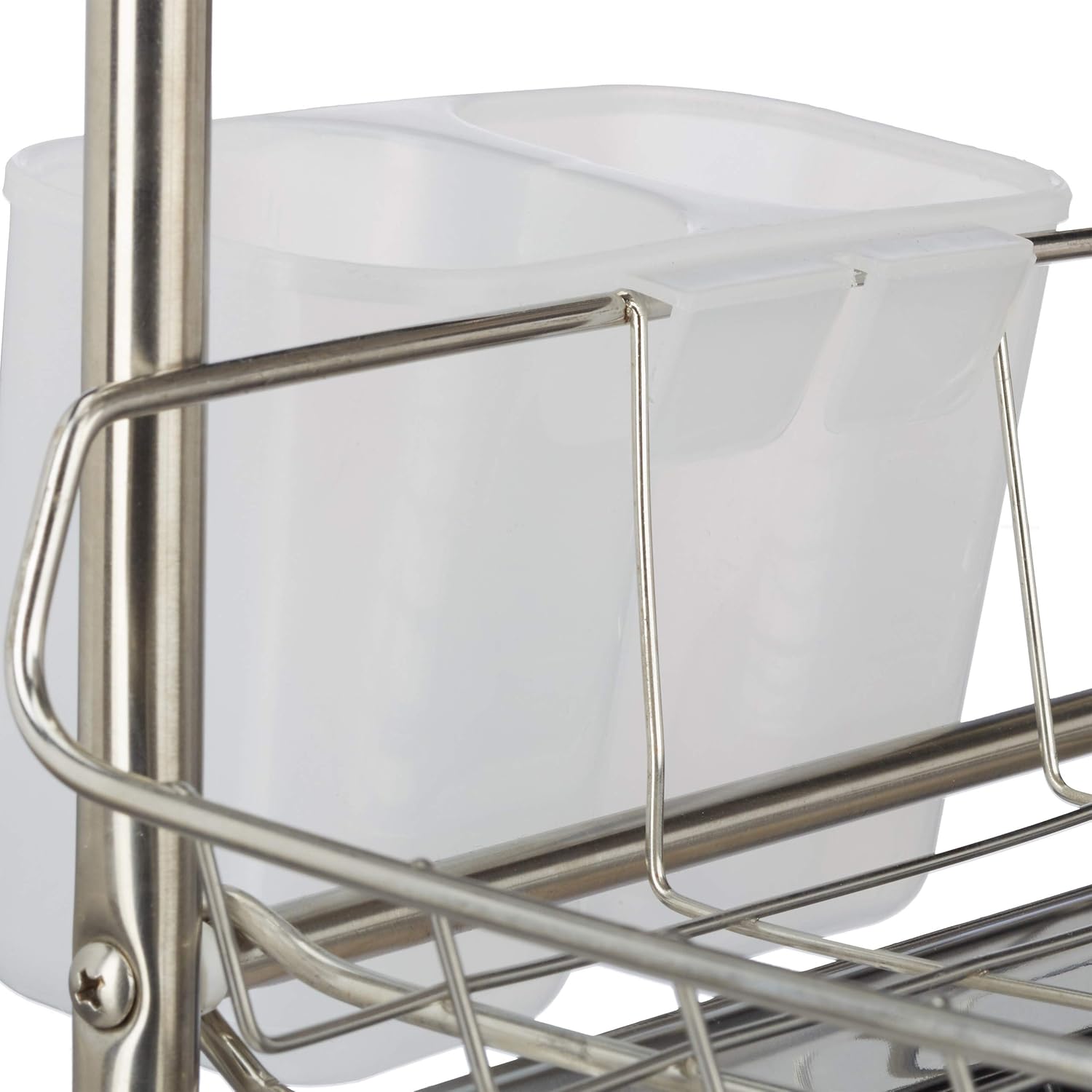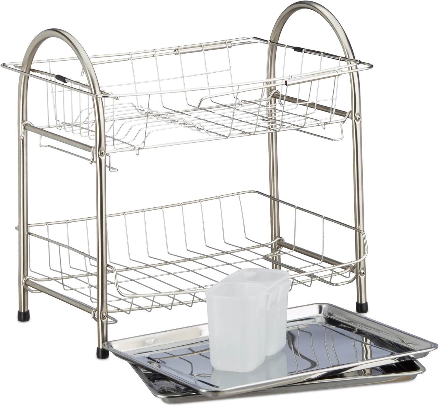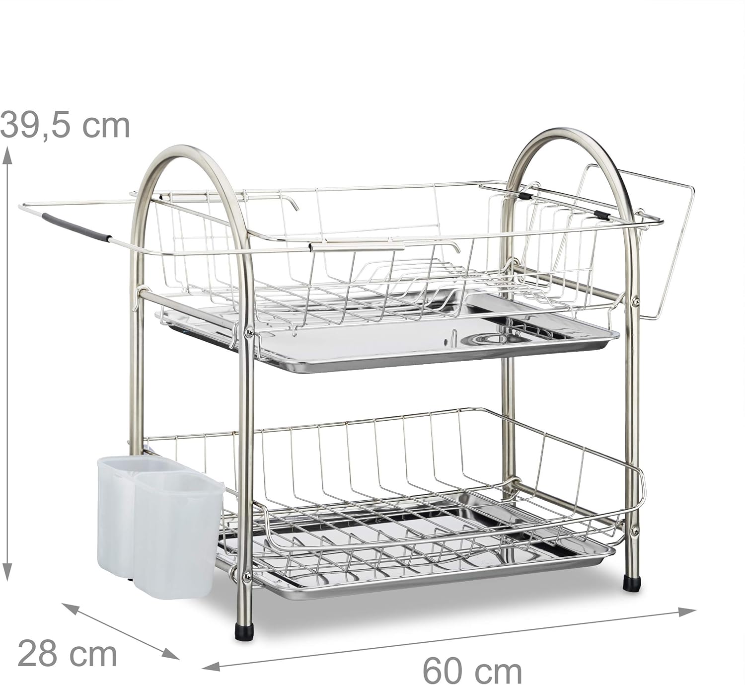 Le Relaxdays 10020389 est un égouttoir à vaisselle en inox doté de deux étages et d'un porte-couverts, avec une grille pour assiettes.
