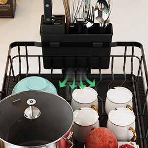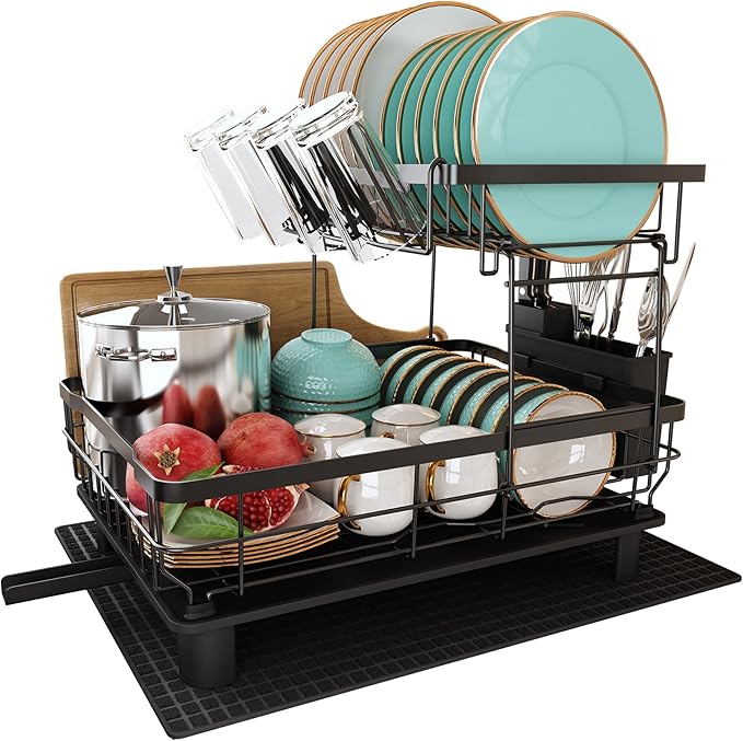 Égouttoir à vaisselle à double niveau en acier inoxydable noir, équipé d’un porte-gobelets et d’un porte-ustensiles, avec tapis de séchage intégré pour une organisation optimale et un séchage efficace dans votre cuisine.
