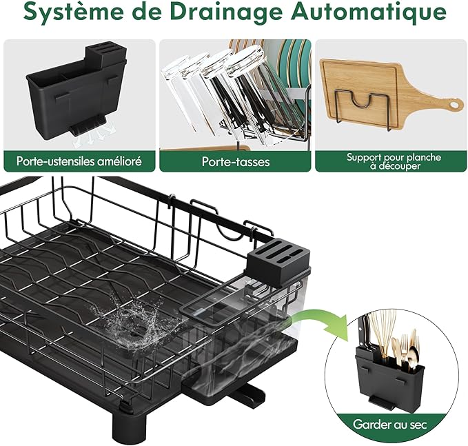 Durable et résistant à la rouille, il inclut un porte-ustensiles sécurisé avec séparateurs pour couteaux et un tapis de séchage pratique.