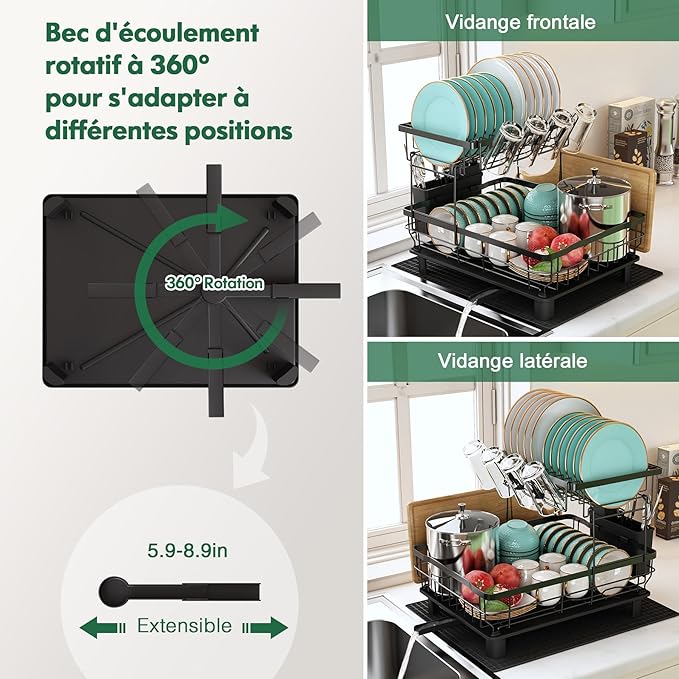 Ce égouttoir à vaisselle double niveau en acier inoxydable est conçu pour optimiser l’espace et garder votre plan de travail sec grâce à sa plaque d’évacuation automatique et son bec rotatif à 360°.