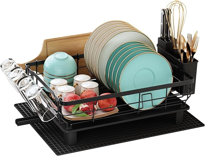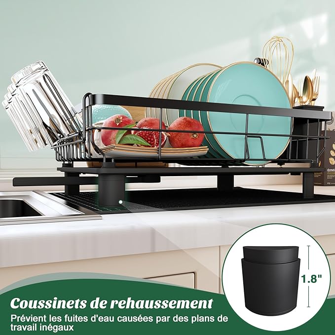 Égouttoir à vaisselle en acier inoxydable avec porte-gobelets et support pour ustensiles, de couleur noire. Ce rangement pratique pour la...