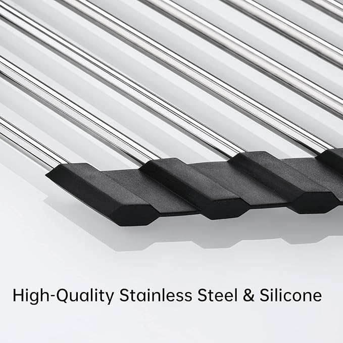 Égouttoir à vaisselle triangulaire en acier inoxydable, pliable et enroulable, conçu pour s’adapter à l’évier de cuisine.