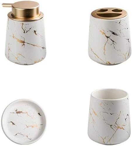 Ce coffret comprend quatre accessoires de salle de bain en céramique marbrée, comprenant un distributeur de savon, un porte-brosse à dents, un gobelet et un porte-savon, tous présentés dans une finition blanche mate élégante.