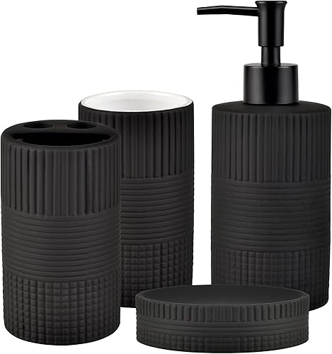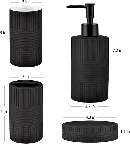 Cet ensemble de quatre pièces en céramique gaufrée finition noir mat comprend un porte-brosse à dents, un distributeur de savon, un porte-savon et un gobelet, offrant une solution complète et élégante pour organiser votre salle de bain.