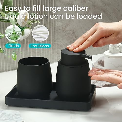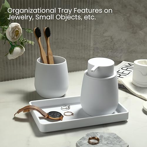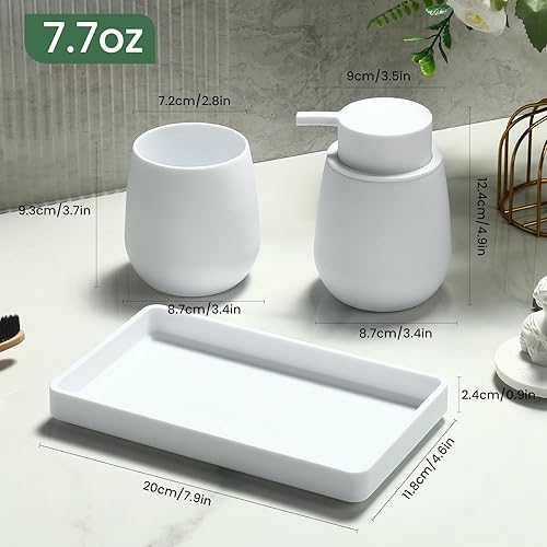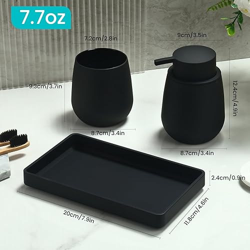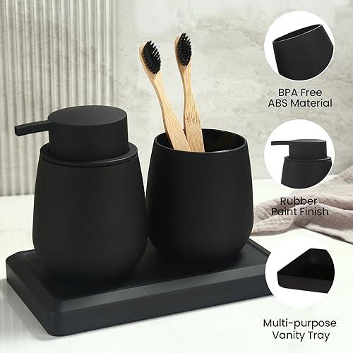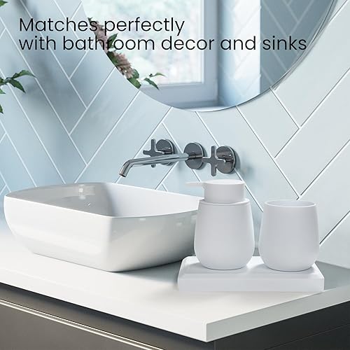 Cet ensemble de salle de bain moderne de 3 pièces comprend un distributeur de savon, un porte-brosse à dents et un plateau au design minimaliste avec une finition mate.
