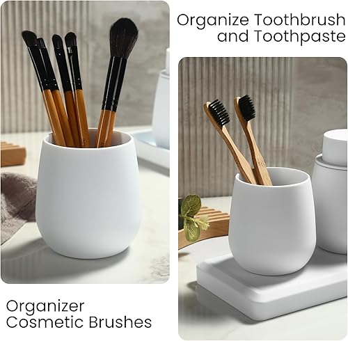 Set de salle de bain contemporain comprenant un distributeur de savon, un gobelet pour brosses à dents, et trois éléments en tout.