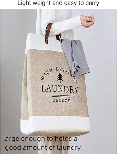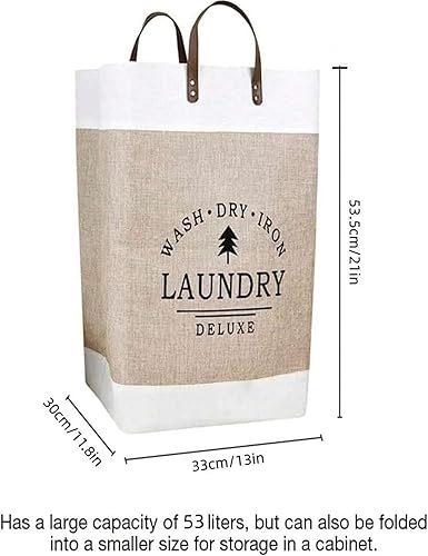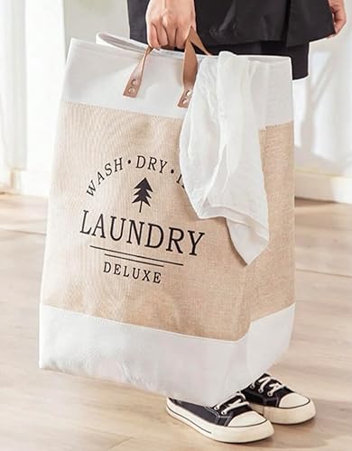 HealthyMoov panier à linge LAUNDRY deluxe avec poignées en cuir, sac de rangement pliable en lin léger, idéal pour vêtements et draps. Conçu pour faciliter le transport, il présente un design moderne. Livré en une pièce.